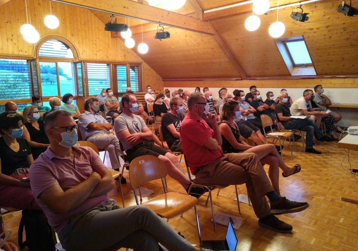 Wegen COVID-19 war die Anzahl der Teilnehmenden auf 70 Personen beschränkt und die Gemeinde bat darum, dass sich pro Familie nur eine Person anmeldet. 47 Personen meldeten sich an, dazu kamen neben den Gemeindevertreter*innen die betroffenen Grundeigentümer*innen sowie ein Landplaner hinzu.