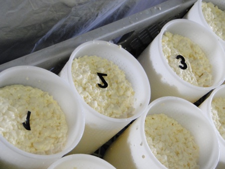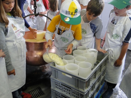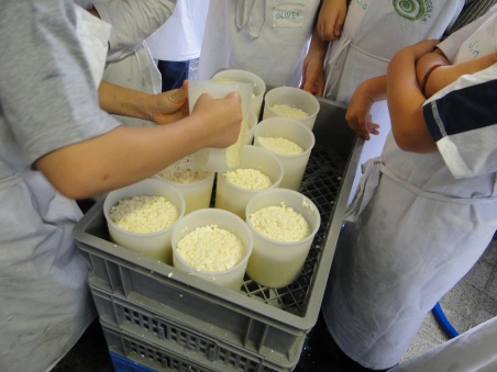 Wieder in der Käserei dürfen die Kinder je eine gelochte Mutschliform mit Schotte und Käse füllen. Die Schotte fliesst ab, zurück bleibt eine hüttenkäseähnliche Masse. Daraus wird in vier bis fünf Wochen ein Mutschli reifen, den die Kinder dann abholen und zuhause mit ihrer Familie teilen dürfen.