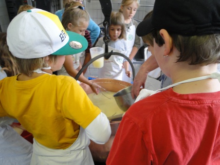 Um halb drei Uhr, beim Besuch von BERN-OST in der Käserei Oberhünigen, kommen die Ferienspass-Kinder gerade aus dem Keller, wo sie etwas über die Herstellung und Reifung von Emmentaler gelernt haben. Im kleinen Kupferkessi in der Käserei wartete der vorbereitete Käse derweil darauf, in die Mutschliformen abgefüllt zu werden.