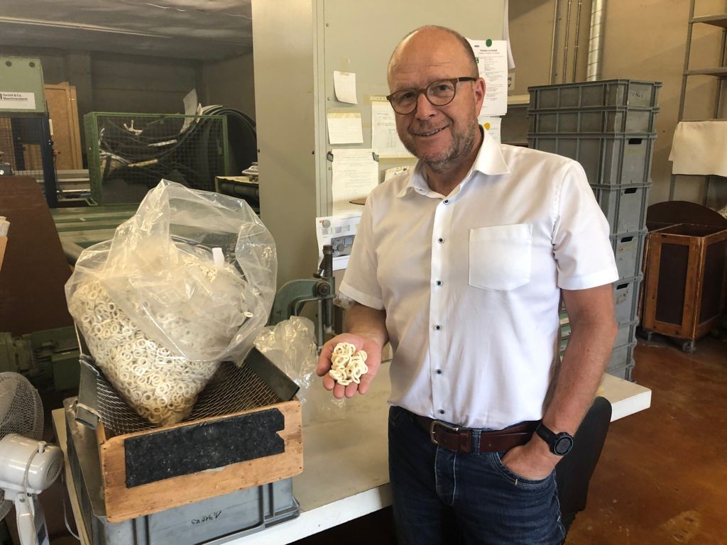 Was so ein Ringli kostet? "Wenn ich Ihnen das sage, fangen die Leute an, meinen Stundenlohn auszurechnen", sagt Sägesser. Teuer seien sie nicht. "Es ist ein Rappenbusiness." Gerade deshalb sei es wichtig, die Abläufe schneller zu machen. Die Maschine, die die Ringli stanzt etwa, ist nicht neu, wurde von Sägesser und seinen Mitarbeitenden selber weiterentwickelt. Ein angebauter Staubsauger befördert das Endprodukt in einen Karton.