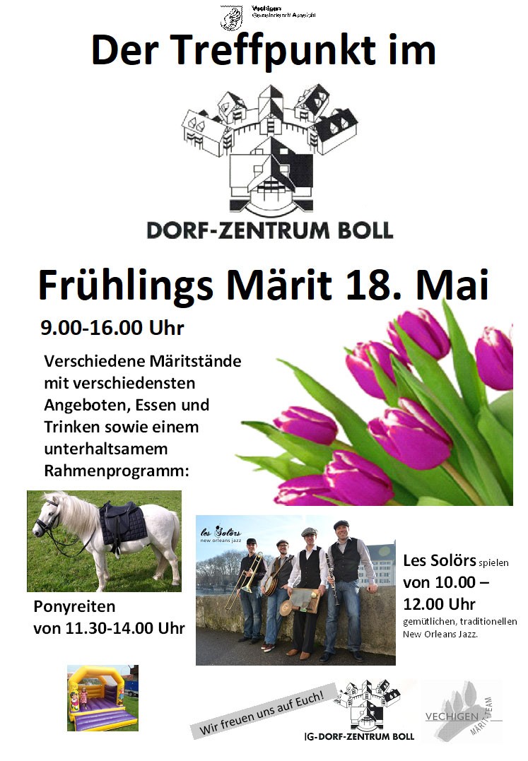Frühlingsmärit mit verschiedenen Ständen mit verschiedensten Angeboten, Essen und Trinken, sowie unterhaltsamem Rahmenprogramm: Ponyreiten, "Les solörs", Hüpfburg,...