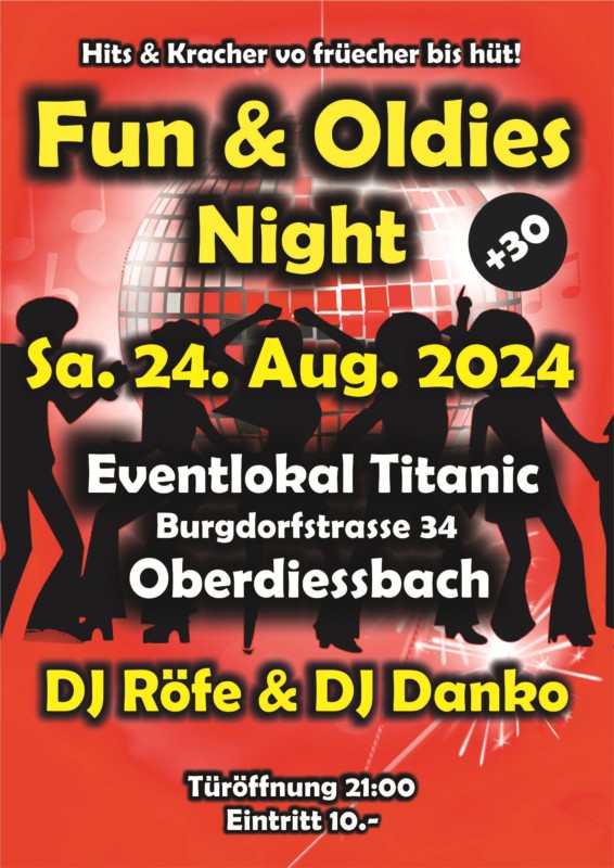 Nach der Sommerpause starten wir wieder mit der beliebten Fun & Oldies Night in Oberdiessbach. Schaut vorbei und geniesst Musik & Drinks!