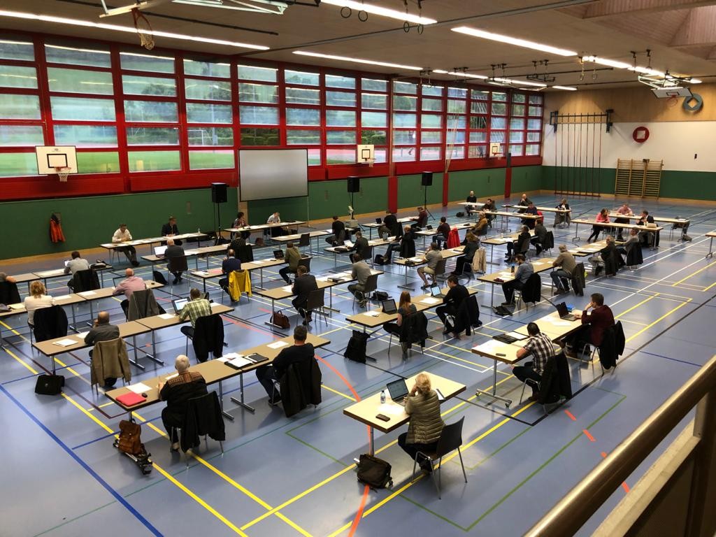 Um die Verbreitung des Coronavirus zu verhindern, sassen Ratsmitglieder, Gemeinderäte und Gemeinderätinnen und die Abteilungsleiter aus der Verwaltung je an einem eigenen 2-Meter-Tisch und blieben da auch, wenn sie sich zu einem Geschäft äusserten. Mobile Mikrofone und eine eigens installierte Verstärkeranlage sorgten dafür, dass sie sich trotz der weiten Distanzen verständigen konnten. Vertrauliche Zwischengespräche fielen so allerdings weg.