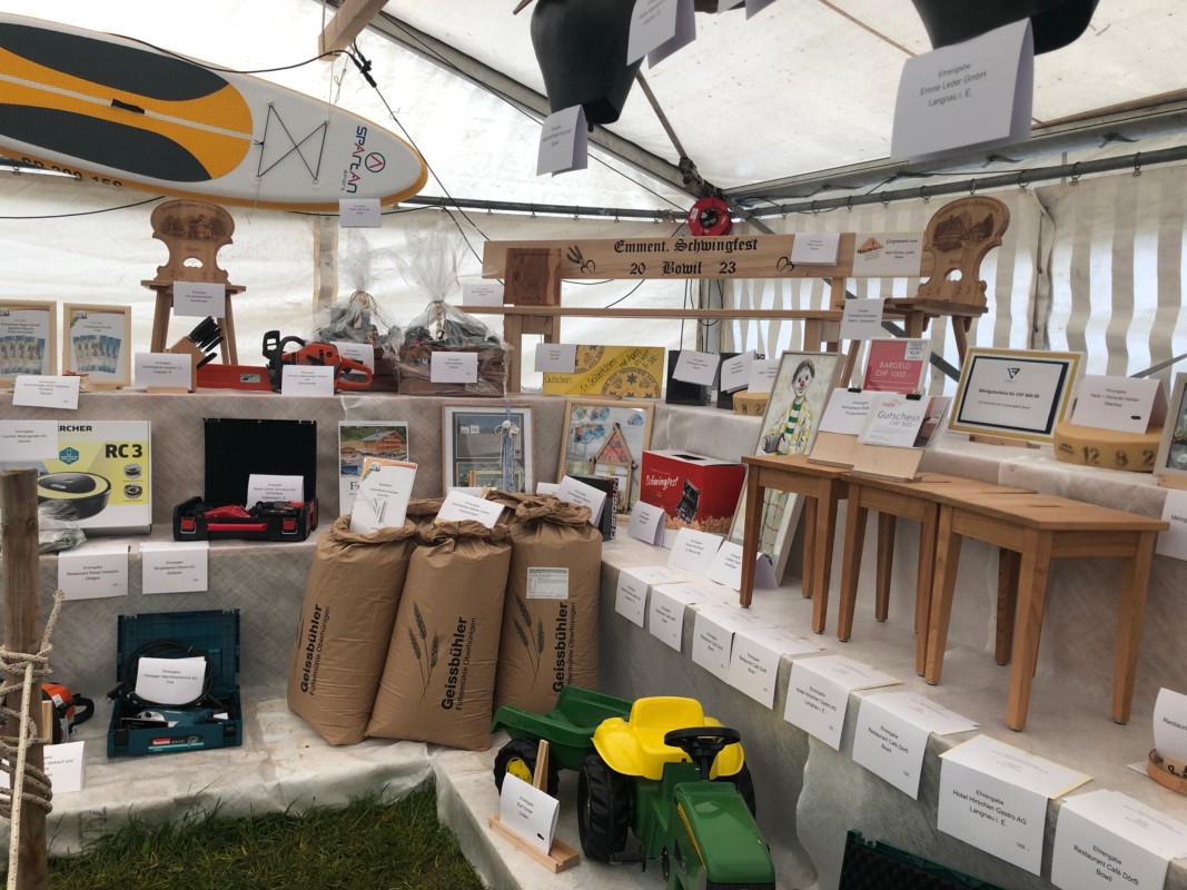 Da sind erstmal die Erinnerungspreise. Vor allem im hölzigen Bereich, zum Beispiel Stabellen, aber auch Bilder, Glocken und Treicheln. Und drei Scherenschnitte hat es, das gibt es nicht alle Jahre. Was es auch immer gibt, sind Bargeldbeträge, dann hat es Ski, ein Velo, einen Rasenmäher, Gutscheine von Hotels und Restaurants, zwei Waschtürme, Wohnzimmertische und andere Möbel.