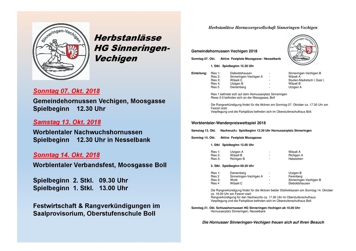 Die Hornussergesellschaft Sinneringen-Vechigen freut sich über jeglichen Besuch unserer Herbstanlässe.