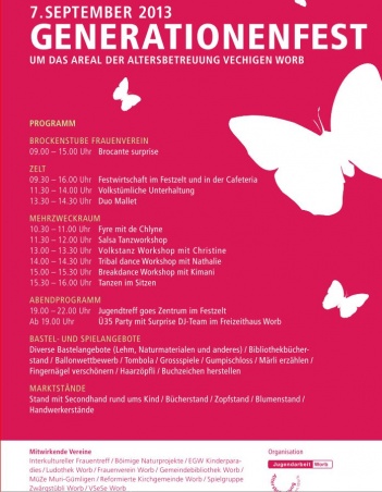 Das Generationenfest, welches jährlich im Zentrum von Worb, in und um die Altersbetreuung Vechigen Worb stattfindet, wird mit einem Bunten Programm am 7. September 2013 stattfinden. Eingeladen sind alle Interessierten im Alter von 1-99. Mehr Infos zu Inhalt und Programm auf dem Flyer.