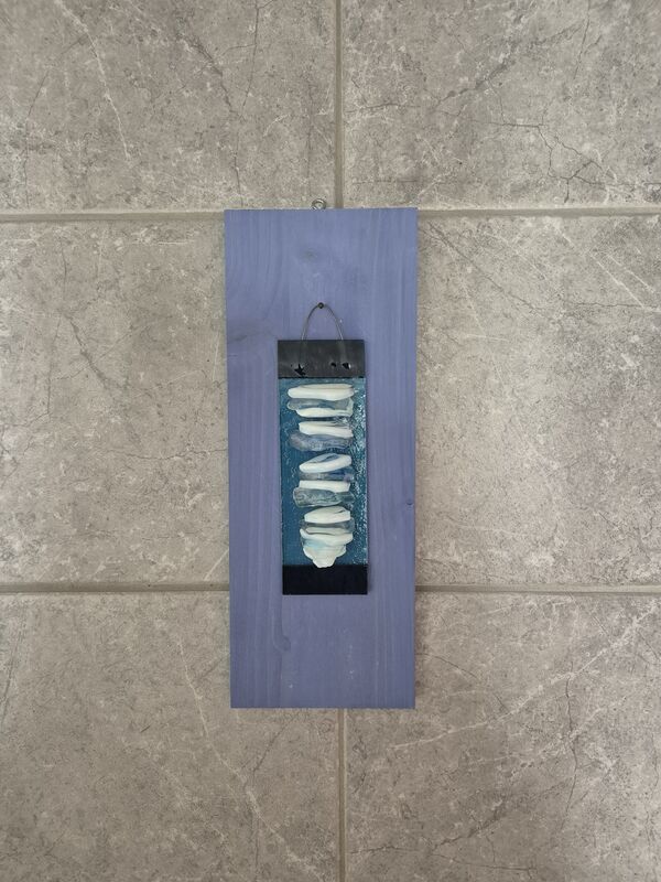 Blaues Holz-Brett und Glas-Deko wurde handgefertigt. Unikat.