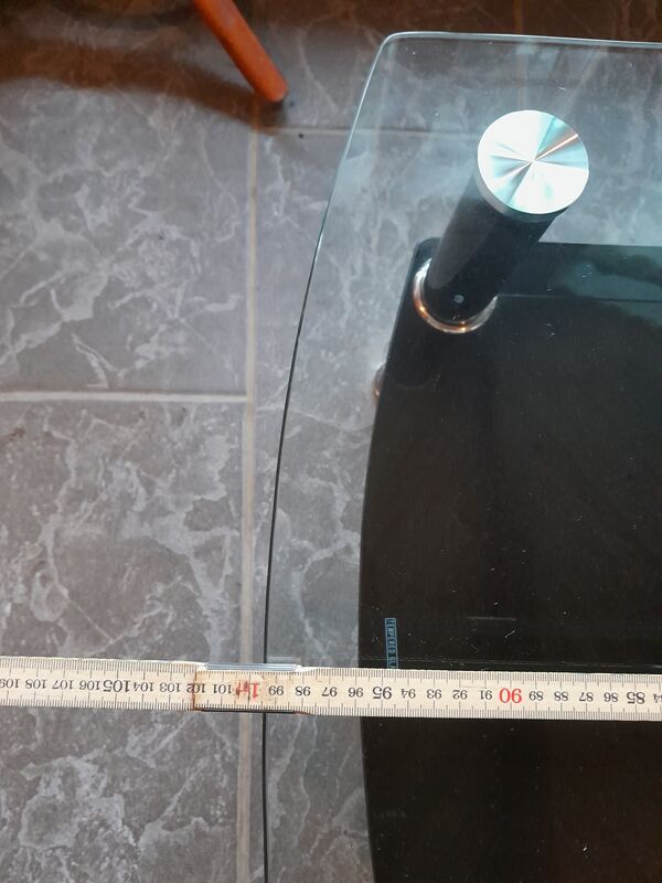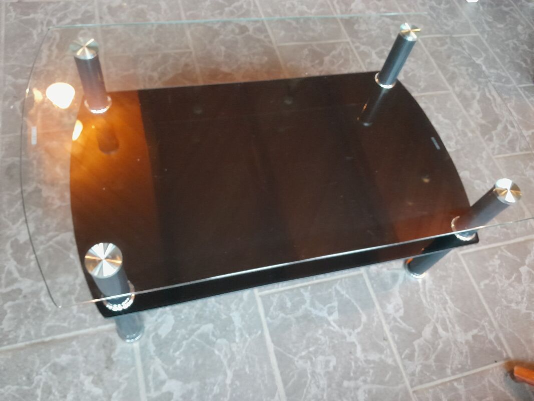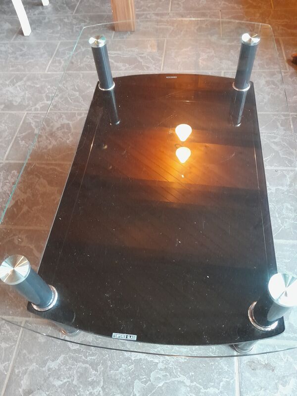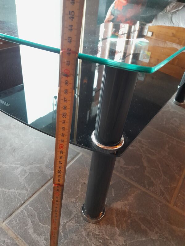 Der Tisch hat oben eine durchsichtige Glasplatte und unten eine schwarze Glasplatte.