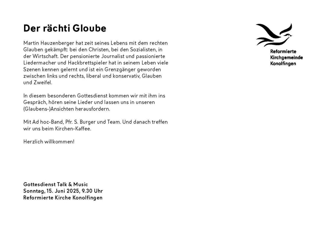 In diesem besonderen Gottesdienst kommen wir mit ihm ins Gespräch, hören seine Lieder und lassen uns in unseren (Glaubens-)Ansichten herausfordern.