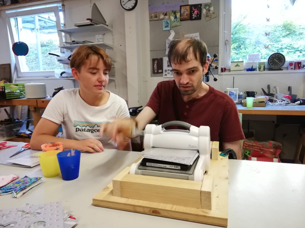 Dass sie diese Aufgaben ausführen können, wirkt wie ein kleines Wunder. Die Mitarbeiter treffen nach und nach im Werkraum ein. Ganz leise, ohne viele Worte. "Nici". Mitarbeiter Nicolas Slongo sagt nur seinen Namen. Ambra Rothenbühler, die im Aarhus ihr Praktikum absolviert, fragt ihn, ob er stanzen möchte. Bald sind sie in ihre Teamarbeit vertieft. Slongo führt konzentriert ein Blatt nach dem anderen in die Stanzmaschine. Heraus kommen Schmetterlinge und Blumen für die Girlanden. Rothenbühler hilft ihm dabei.