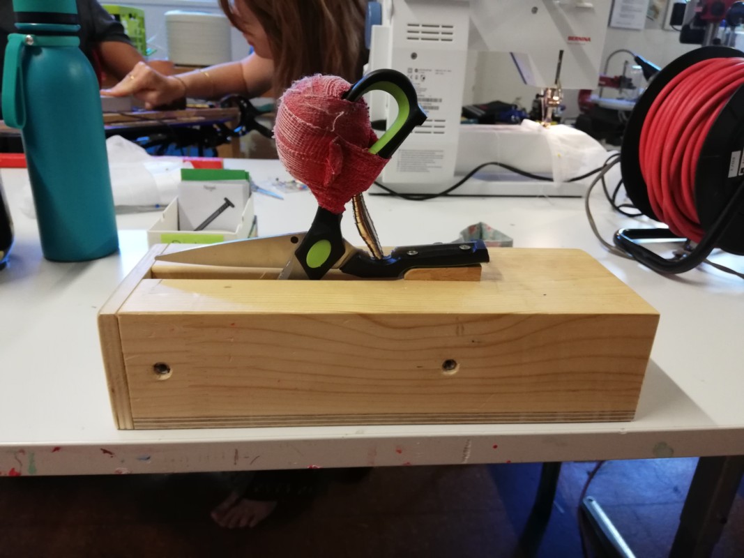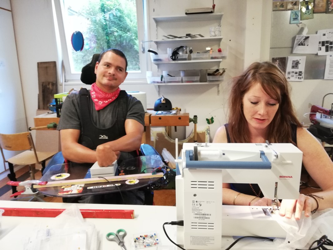 Cédric Jenzer möchte nähen. Er sitzt im Rollstuhl, auch seine Hände sind in den Bewegungen sehr stark eingeschränkt. Cédi, wie er am liebsten genannt wird, ist sehr aufgeschlossen und freut sich über Besuch im Atelier. Das Pedal der Nähmaschine wird ihm auf den Tisch seines Rollstuhls gestellt, er bedient es mit der Hand. Valérie Wetzel führt den Stoff. Auch sie beide arbeiten in Teamarbeit. "Stopp!", ruft sie ab und zu. Sofort lässt Jenzer das Pedal los. "Eigentlich sieht er es auch selber, wann er stoppen muss. Er macht das sehr gut", sagt die Leiterin.