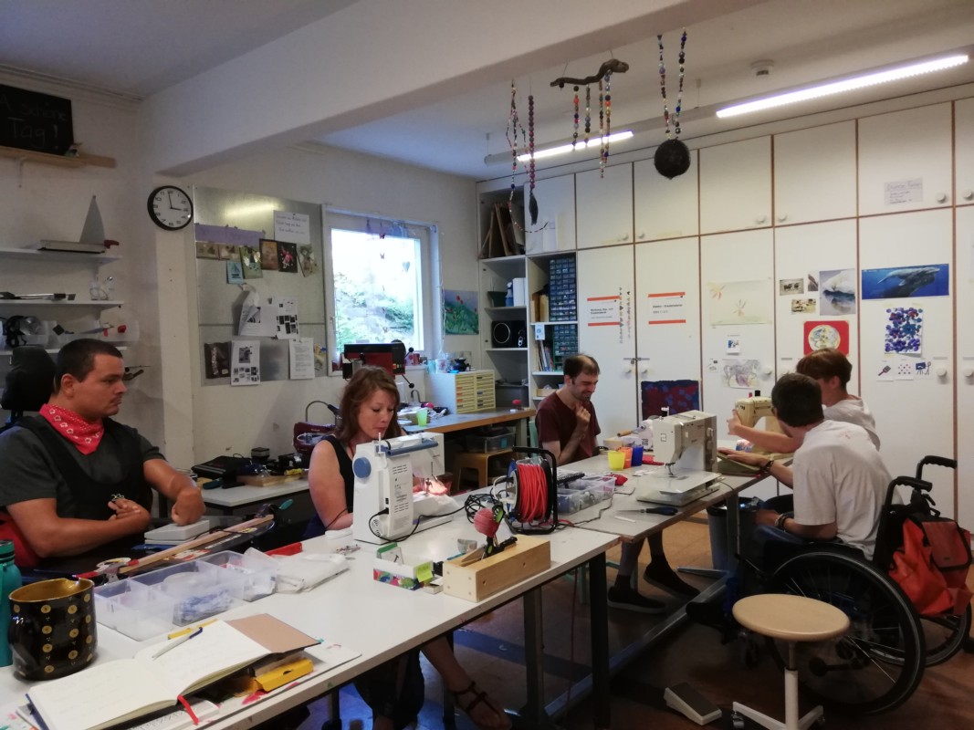 Atelier Aarhus Grosshöchstetten. Alles steht für die Mitarbeiterinnen und Mitarbeiter aus den verschiedenen Wohngruppen bereit: Nähmaschinen, Stanzmaschinen, besondere, von der Ergotherapeutin entwickelte Scheren, Papier. Womit sie sich kreativ beschäftigen wollen, entscheiden sie selber. Es gibt eine breite Palette an Angeboten. "Im Moment sind wir häufig am Nähen", sagt Valérie Wetzel, Sozialpädagogin und Leiterin des Kreativateliers für Menschen mit schweren körperlichen und Mehrfachbehinderungen. "Girlanden, Einkaufstaschen für das Abfüllen von Obst und Gemüse."