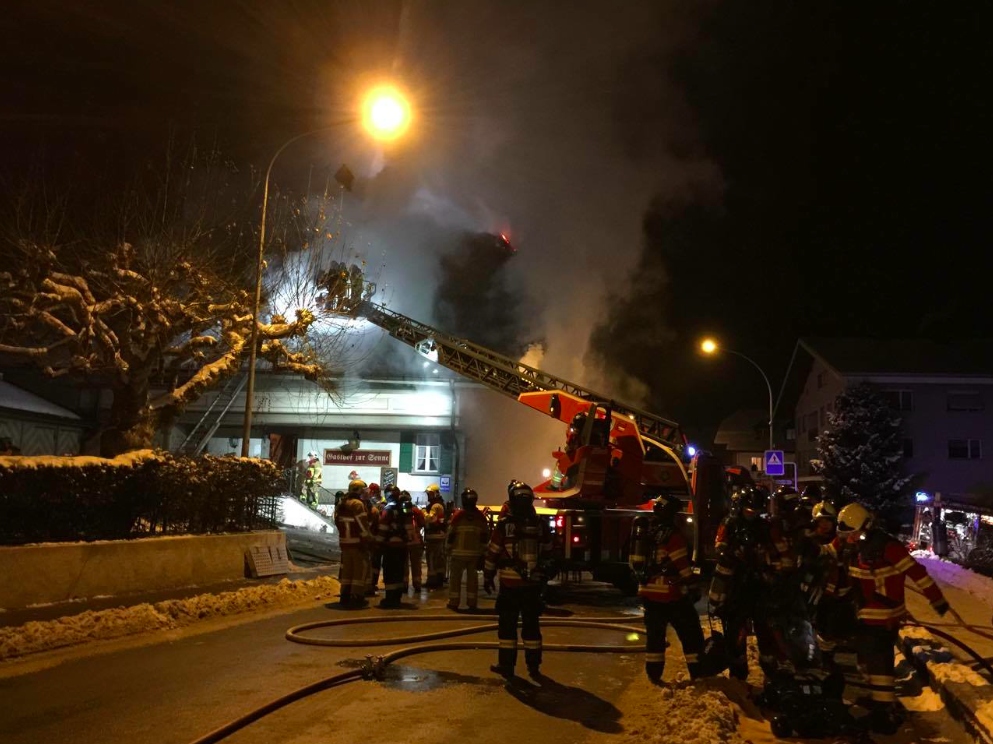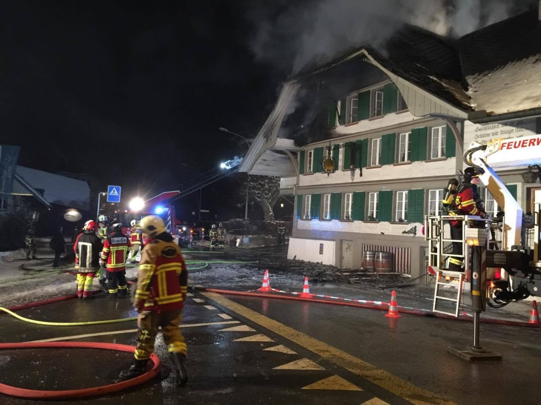 Bei der Kantonspolizei Bern ging am Montag kurz vor 1930 Uhr die Meldung ein, wonach der Gasthof Sonne an der Dorfstrasse in Grosshöchstetten in Brand geraten sei. Die sofort ausgerückten Einsatzkräfte fanden Teile des Gebäudes bereits in Vollbrand vor. Die Löscharbeiten dauerten am späten Montagabend noch an.