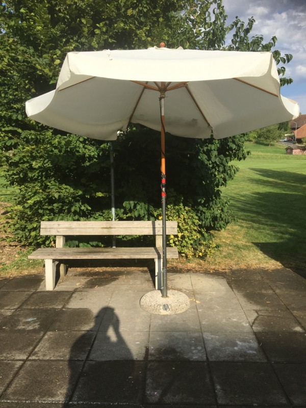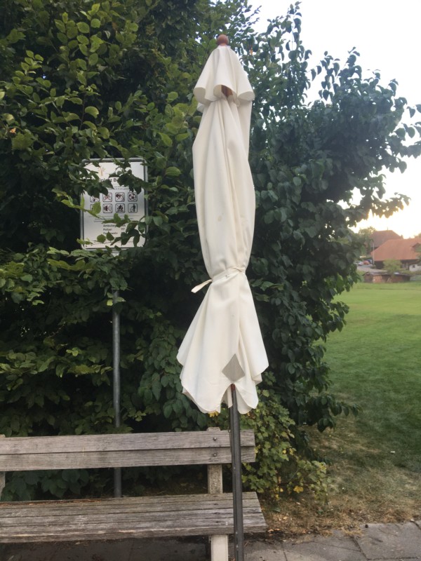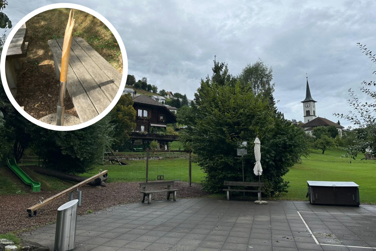 Rolf Bühler sorgt seit vielen Jahren für Ordnung auf der Bühlmatte in Grosshöchstetten. Vor ein paar Tagen hat er den Sonnenschirm noch geschlossen, wie er BERN-OST erzählt. Zwei Tage später, als er den Schirm für den Spielnachmittag wieder öffnen wollte, fand er nur noch den abgebrochenen Schirmmast und einen kaputten Sockel. Der Schirm mit fast drei Meter Durchmesser wurde bis anhin nicht gefunden.