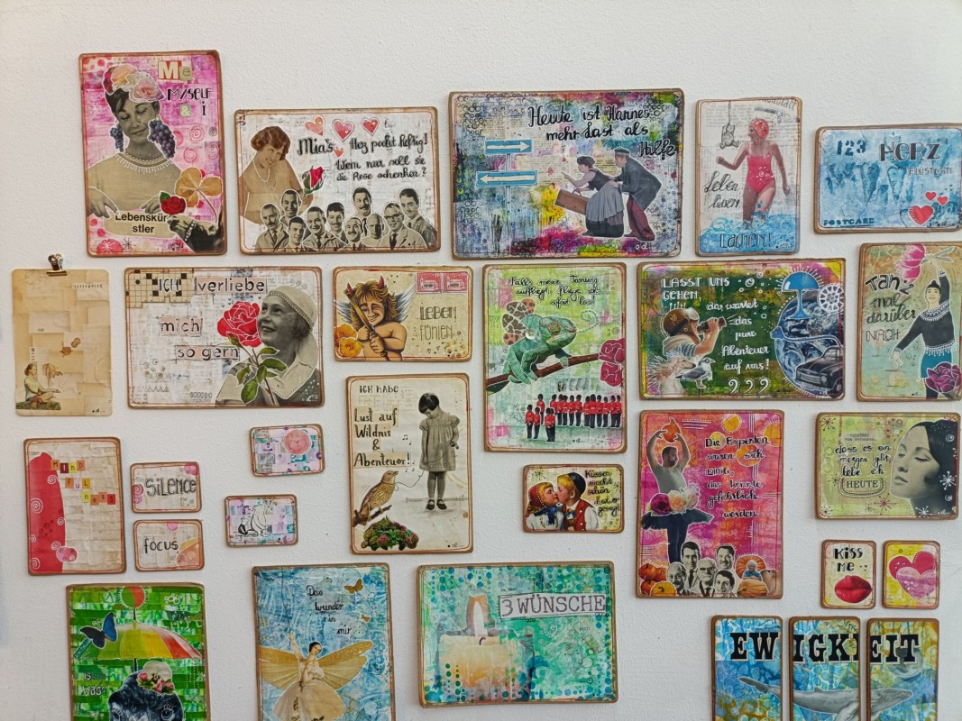 Beschwingt führt Claudia Lerch durch ihr Reich: Gleich hinter dem Eingang steht ein grosser Tisch, an dem mehrere Personen miteinander malen und gestalten können. Überall stehen Farben und Pinsel, die Wände sind verziert mit ihren Werken. In Einzel- oder Gruppenkursen vermittelt sie anderen Menschen, wie sie mit Hilfe von Pinsel und Papier innere Ruhe, Gelassenheit oder Kraft finden können.