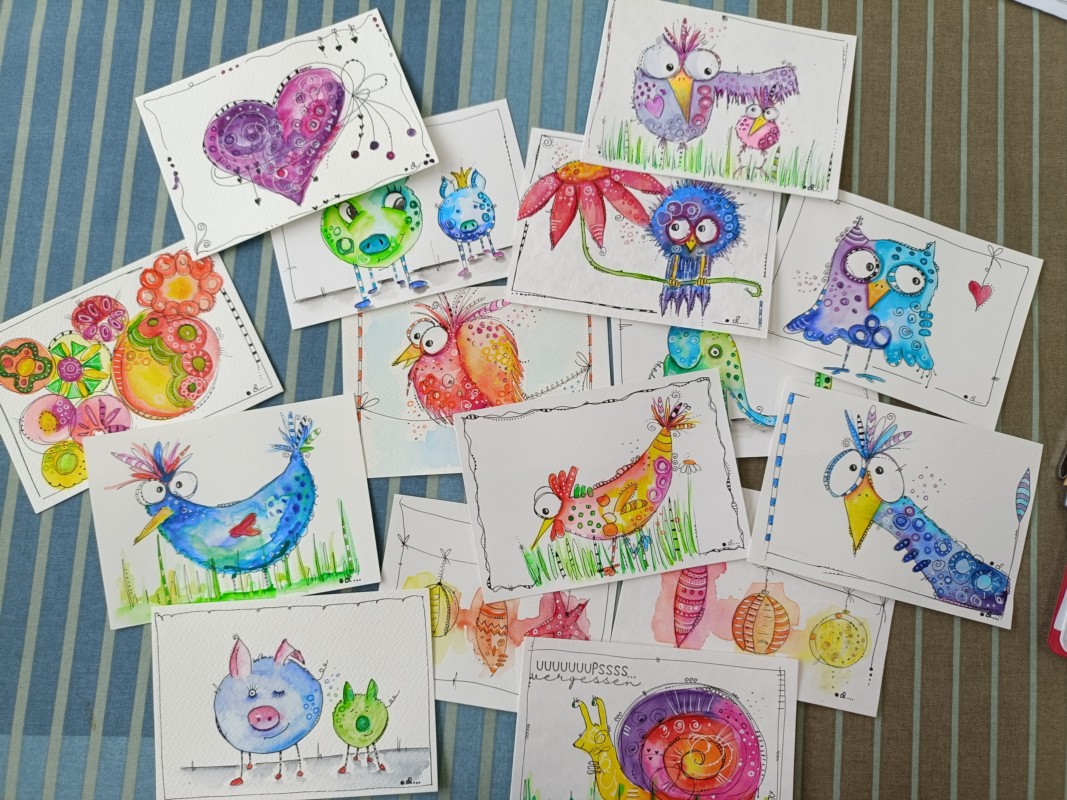 Sie selbst hat 2018 mit Happy Painting angefangen, einer comicähnlichen Zeichenmethode mit leuchtenden Farben. «Das ist bunt und fröhlich und macht ganz schnell süchtig», merkte sie rasch. Zuerst brauchte sie das Zeichnen nur für sich, um vom Alltag abzuschalten und in der Kreativität Energie aufzutanken. Seit 2019 gibt sie in ihrem eigenen Atelier in Grosshöchstetten diverse bunte und fröhliche Kreativkurse, «die allesamt ein bisschen süchtig machen», wie sie sagt.