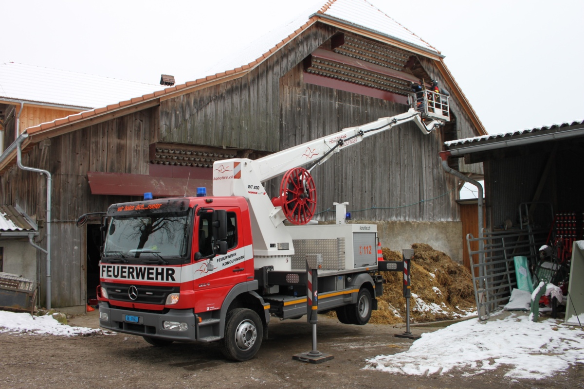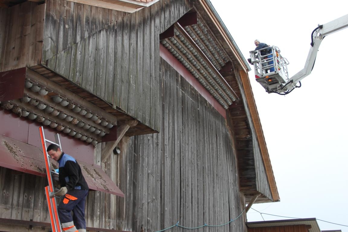 Unterstützung erhielt der OVK diesmal von der Feuerwehr Konolfingen. Mit ihrem Hubretter erleichterte sie die aufwändige Arbeit in luftiger Höhe. Dank der neuen Montage der Nisthilfen können diese einfacher und schneller gereinigt werden. Zudem sind die gefiederten Gäste aus dem Süden in ihrer neuen Behausung auch sicher vor ihren Feinden, dem Marder und dem Baumfalken.