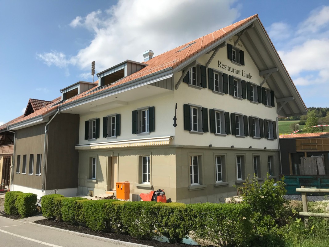 Vor acht Jahren ging das Restaurant Linde in Habstetten zu. Nun wird langsam auch von aussen sichtbar, dass die Neueröffnung bald bevorsteht. Seit Dienstag ist das Gerüst weg und die Fassade zeigt sich in neuem Glanz.