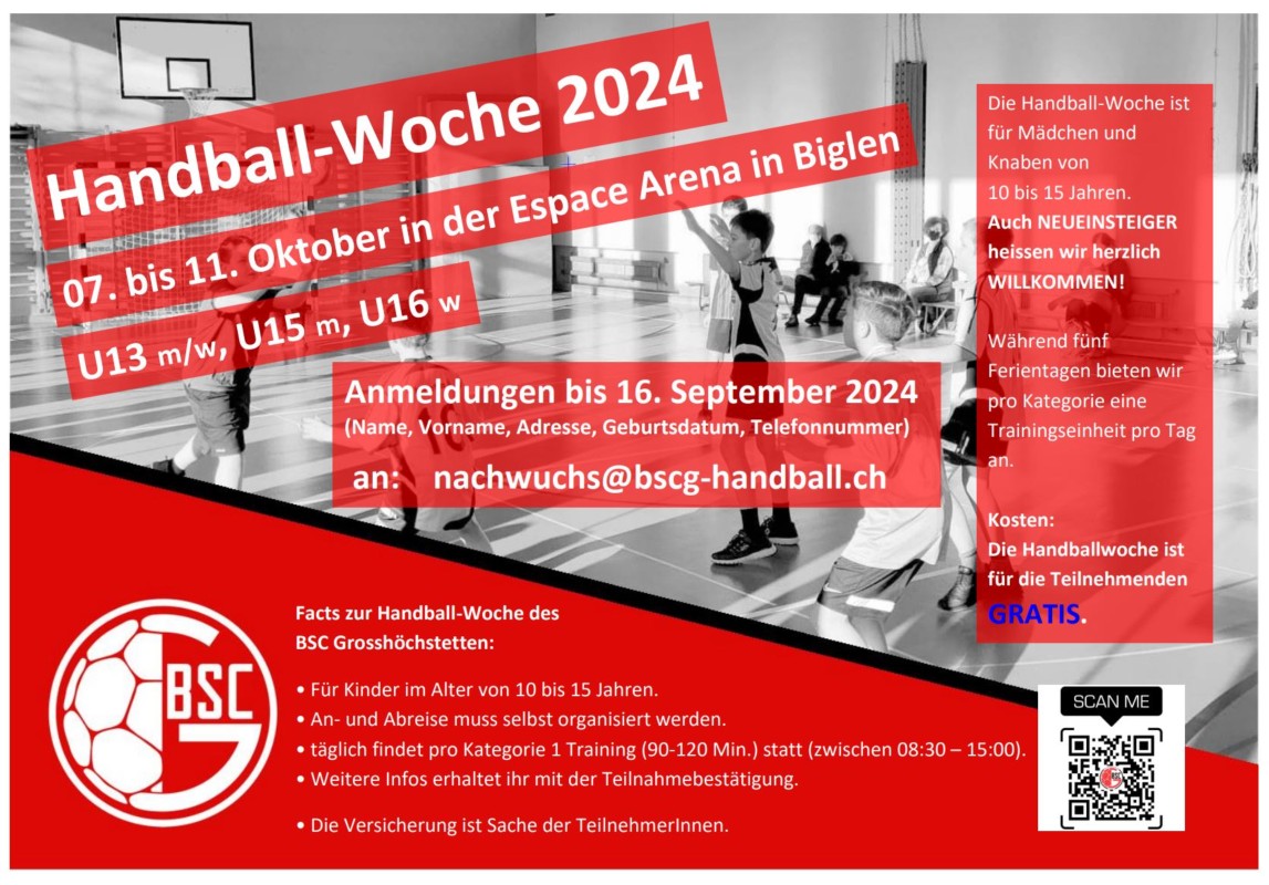 Vom 07. bis 11. Oktober 2024 führen wir (BSC Grosshöchstetten) eine Handball-Woche in der Espace Arena in Biglen durch. Angesprochen sind Mädchen und Knaben von 10 bis 16 Jahren. Auch Neueinsteiger heissen wir herzlich willkommen.
