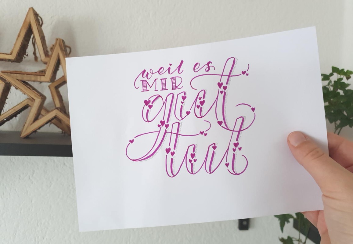 Du lernst die Grundlagen vom Handlettering, lernst verschiedene Schriftstile und gestaltest eine eigene Karte. Du brauchst keine schöne Handschrift, sondern einfach Freude daran, mit Buchstaben gestalten zu können.