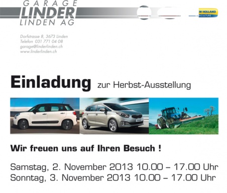 Besuchen Sie unsere Herbstausstellung mit den Neuheiten der Marken FIAT, KIA, NEW HOLLAND Traktoren, KUHN Landmaschinen und diversen Kleingeräten. Wir freuen uns auf Ihren Besuch !