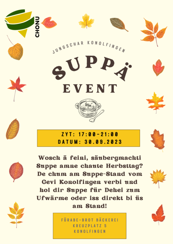 Hast du Lust auf eine leckere, hausgemachte Suppe an einem kalten Herbsttag? Dann komm beim Suppenstand des Cevi Konolfingen vorbei und hol dir die leckere Suppe als take away zum Zuhause essen oder geniesse Suppe und Gesellschaft an unserem Stand. Wir freuen uns!
