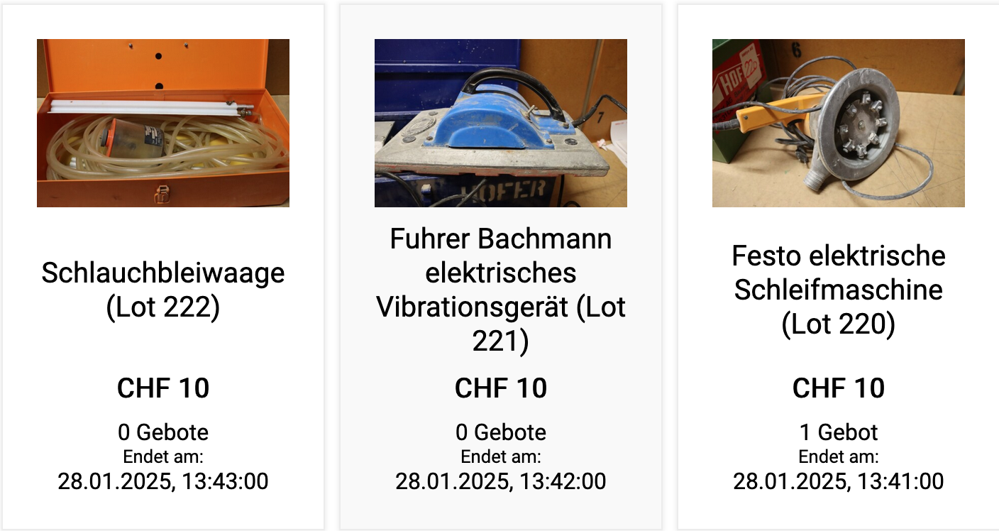 Wer jetzt noch Versteigerungsgegenstände vor Ort besichtigen möchte, muss sich beeilen: Am Samstag, 25. Januar, ist der letzte Besichtigungstag vor Ort. Zum Überlegen und Bieten bleiben dann noch drei Tage. Danach ist die Auktion vorbei. Allerdings nicht mehr so, wie früher bei den Auktionen vor Ort, mit der Frage «Wer bietet mehr – zum Ersten, zum Zweiten, zum Dritten», sondern ganz einfach durch eine elektronische Meldung.