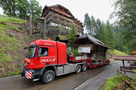 Bereits gestern Morgen also befestigte ein Team von Zimmermännern aufwändig zwei grosse Trageriemen am Spycher. An diesen hob der Kran ihn langsam in die Luft und trug ihn zwischen den Bäumen zur Strasse hinunter, wo der Spycher auf einem Lastwagen weitertransportiert wurde. Anschliessend wurde die gesperrte Strasse wieder geöffnet. Zurück blieben das Fundament und die Lücke im Zaun.