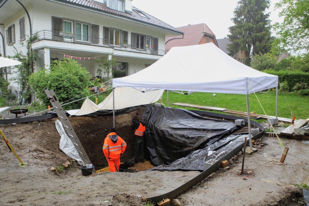 Der Archäologische Dienst untersuchte die Fundstelle am 21. Mai. Dabei kamen Reste einer für die Spätbronzezeit typischen Brandbestattung zum Vorschein. Nach Abschluss der einwöchigen Grabung konnte Aeschbacher seinen Teich fertigstellen.