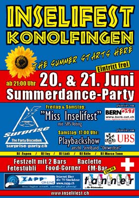 SUMMERDANCE-PARTY mit Surprise-Party-Discothek. Festbetrieb mit Bars, Raclette, Grill, Tombola. Wahl zur "MISS INSELIFEST".