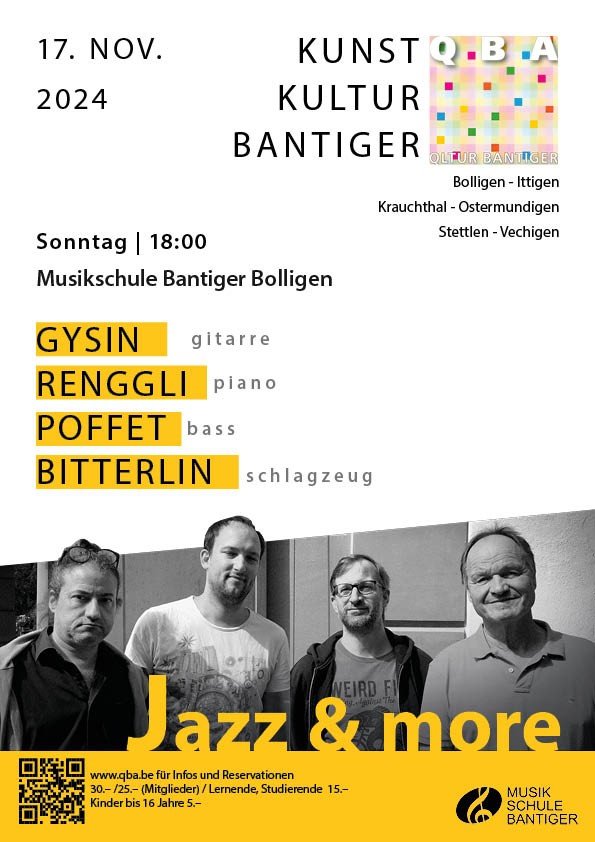 Yves Gysin - Gitarre, Andreas Renggli - Piano, Michel Poffet - Bass und Lukas Bitterlin - Schlagzeug. Die vier Jazzer aus der Region Bern präsentieren Eigenkompositionen und ausgewählte Perlen der Jazzgeschichte. Im Fokus steht der Groove, mal subtil balladesk, mal zupackend swingend.