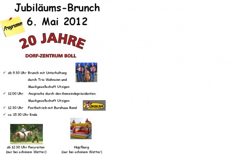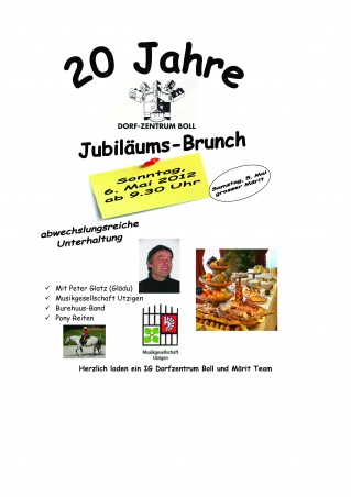wir laden Sie herzlich ins Dorfzentrum Boll ein zum Jubiläums-Brunch mit vielen Aktivitäten für Jung und Alt.