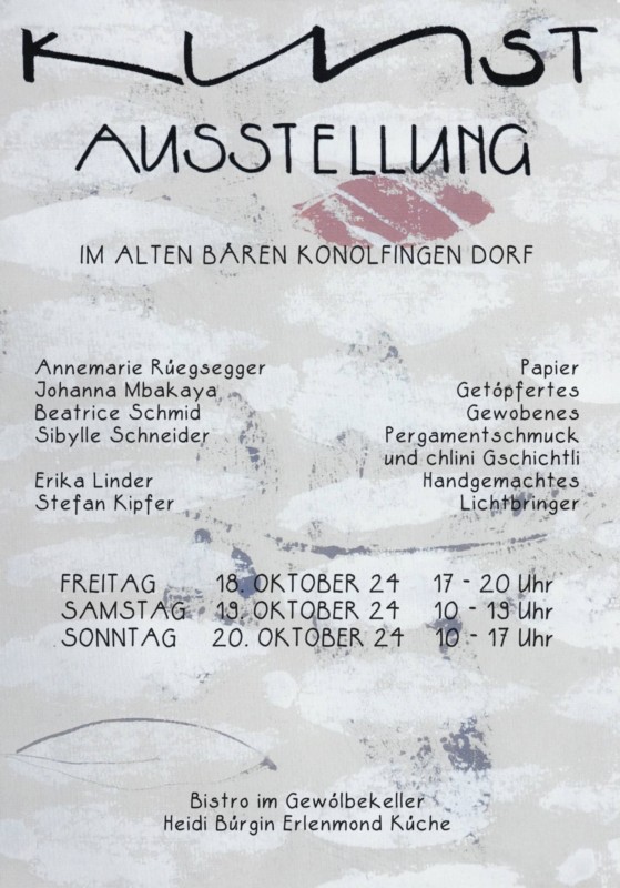 Auch wenn es bereits die 30. Kunstausstellung im Dachstock des alten Bären ist, keine der bisherigen Ausstellungen glich der anderen. Fünf Künstlerinnen und ein Künstler zeigen vom 18. bis 20. Oktober 2024 ihre faszinierenden Kunstwerke. Das Bistro, das zudem von Heidi Bürgin mit einem feinen Angebot geführt und von Stefan Kipfer wunderschön mit seinen Lichtbringer geschmückt wird, lädt zum Verweilen ein. Gemütlich kann man so auf das Ausstellungserlebnis zurückblicken.