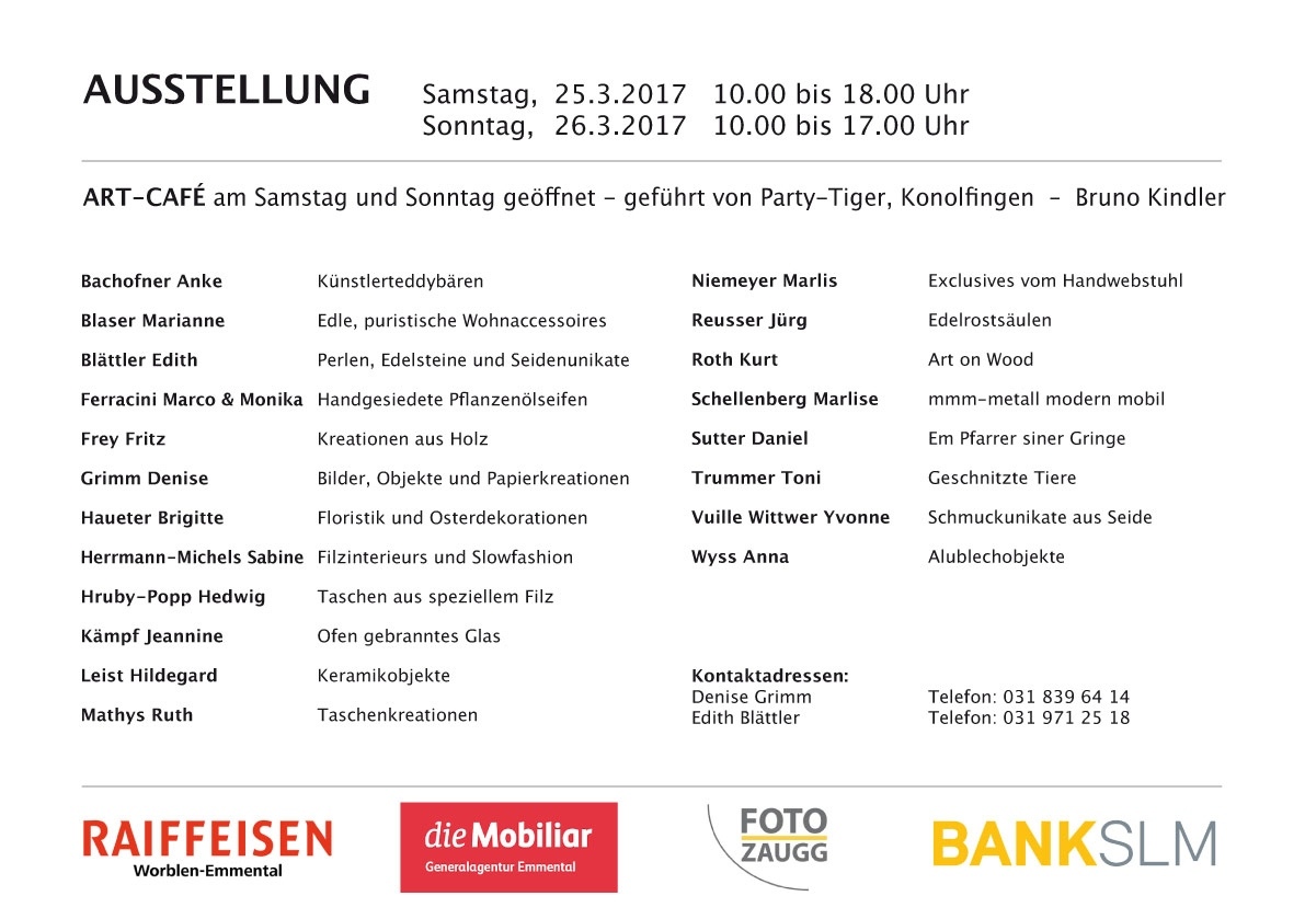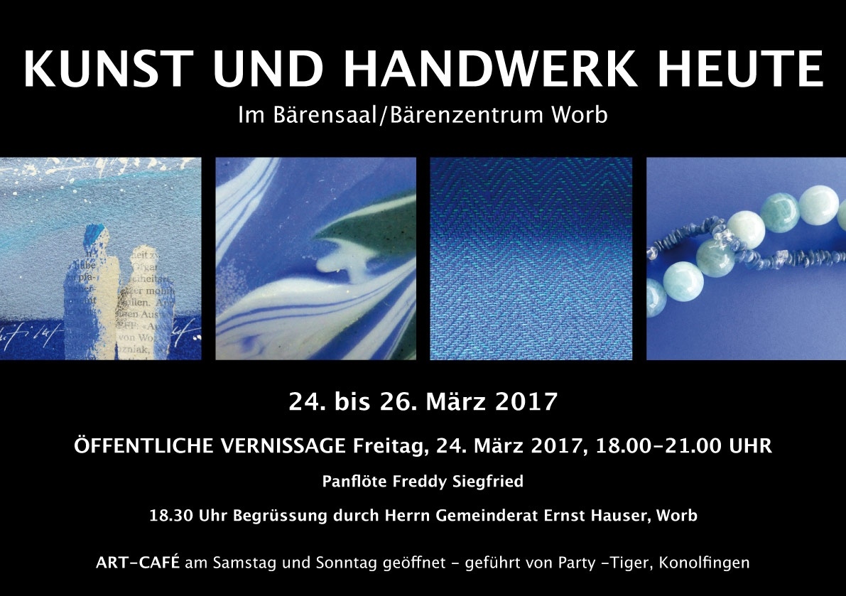 Am Wochenende vom 24. bis 26. März 2017 findet im Bärensaal/Bärenzentrum in Worb zum achten Mal die bereits zur Tradition gewordene Ausstellung KUNST UND HANDWERK HEUTE statt. Die Organisatorinnen Denise Grimm und Edith Blättler legen grosses Gewicht auf die Qualität der Ausstellungsobjekte und deren Präsentation. Für viele Besucher ist diese Ausstellung deshalb auch schon seit längerer Zeit in der Agenda notiert. Auch dieses Jahr ist es dem OK gelungen, neue in Worb noch unbekannte Aussteller zu gewinnen, die Kunst und Handwerk auf hohem Niveau anbieten werden. Die Ausstellung soll selbsttragend sein und wird daher auch von Sponsoren unterstützt, ihnen sei herzlich gedankt.