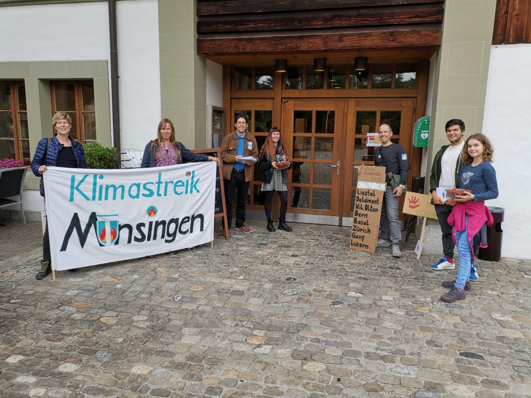 Mit grossen Bannern und Plakaten stellten sich Mitglieder des Münsinger Klimastreiks am Dienstagabend vor dem Gemeindesaal Schlossgut auf. Hier wollten sie den Parlamentarierinnen und Parlamentariern vor der Sitzung begegnen. Die Aktivisten verteilten frische Erdbeeren vom Biohof Trimstein - aber auch einen Brief mit ihren Forderungen. "Bis auf zwei, drei Ausnahmen haben alle den Brief angenommen", sagt Beat Sommer von der Gruppe Klimastreik Münsingen.