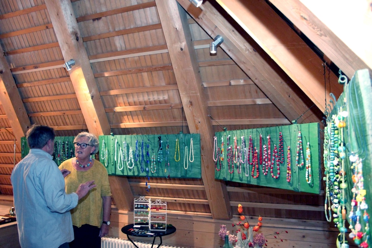 Glas in bunter Vielfalt und unterschiedlichsten Grössen verarbeitet Barbara Stalder zu Schmuck. Die farblich abgestimmten Ketten oder Ringe sind passende Accessoires für jeden Anlass. Filigrane Kunstwerke zum Aufstellen oder als Wandschmuck präsentiert Erina Rufibach. Ihre feinen Metallobjekte die sie mit farbigem Lack ausfüllt und mit unterschiedlichen Gegenständen kombiniert sind der Hingucker in jedem Zimmer.