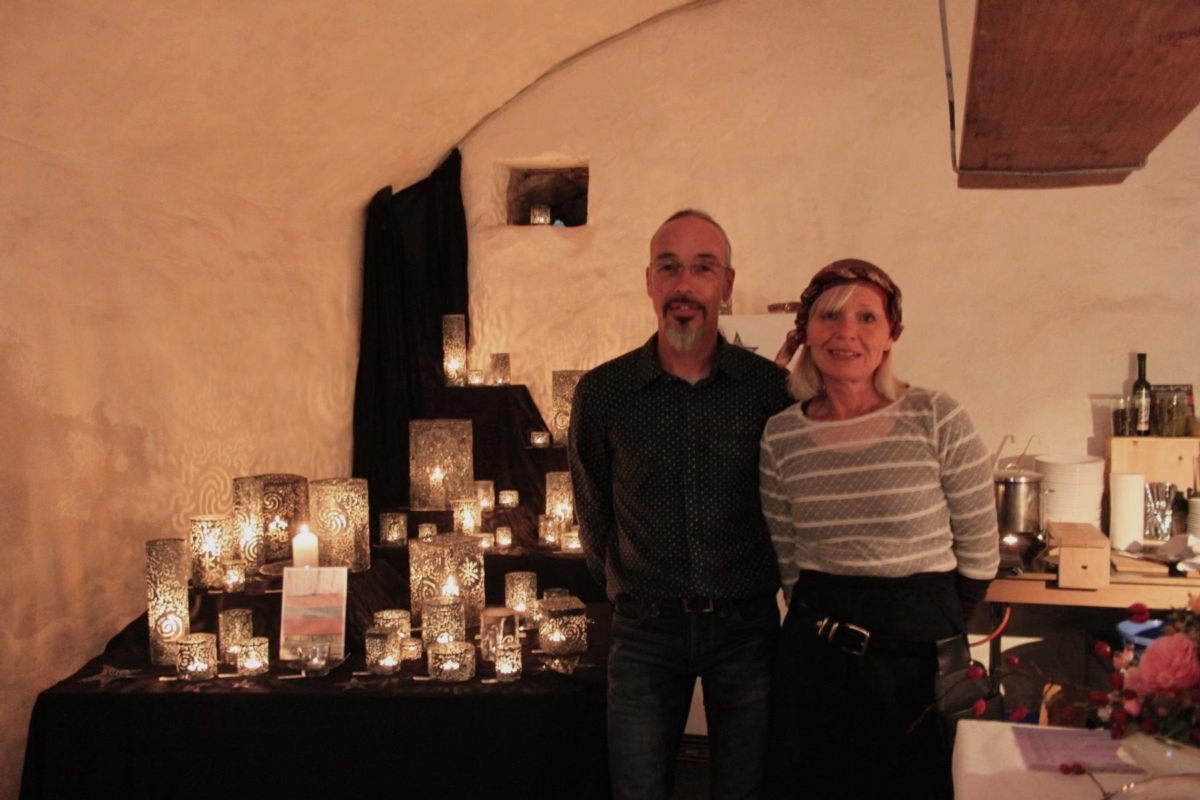 Auch der Gewölbekeller ist kaum mehr wieder zu erkennen. Das Kerzenlicht, das aus alten, mit Schneidbrenner bearbeiteten Büchsen und Dosen strahlt, geben das besondere Ambiente. Stefan Kipfer kreiert diese vielfältigen Lichtobjekte in den unterschiedlichsten Grössen und Formen. Gemeinsam hat er so mit seiner Lebenspartnerin Heidi Bürgin den Gewölbekeller eingerichtet.