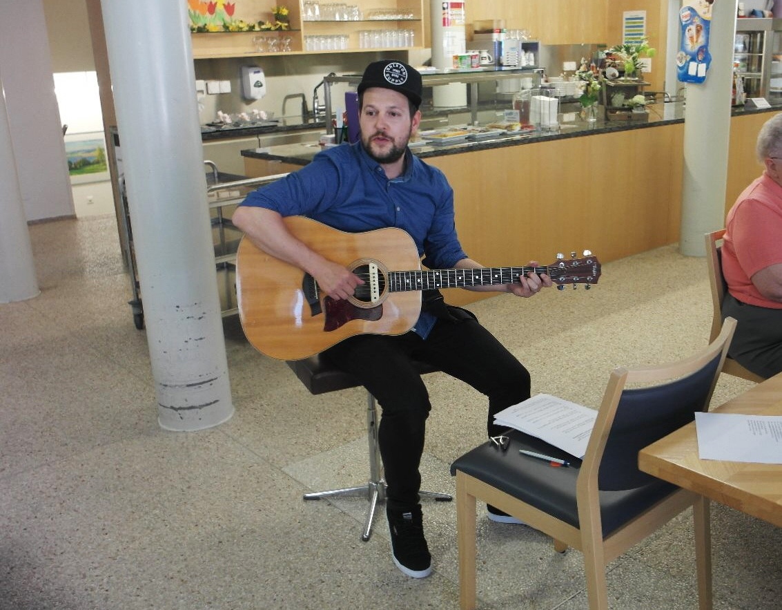 Die anfänglich sehr gespannten Sängerinnen und Sänger machten schon bald mit grosser Begeisterung mit. Mit „Ha gar ke Zyt“ aus der Feder von Christian Häni selbst, konnte der versierte Musiker die Anwesenden bald zum Mitsingen motivieren und es ertönte fröhlicher Chorgesang aus der Cafeteria des Alterszentrums.