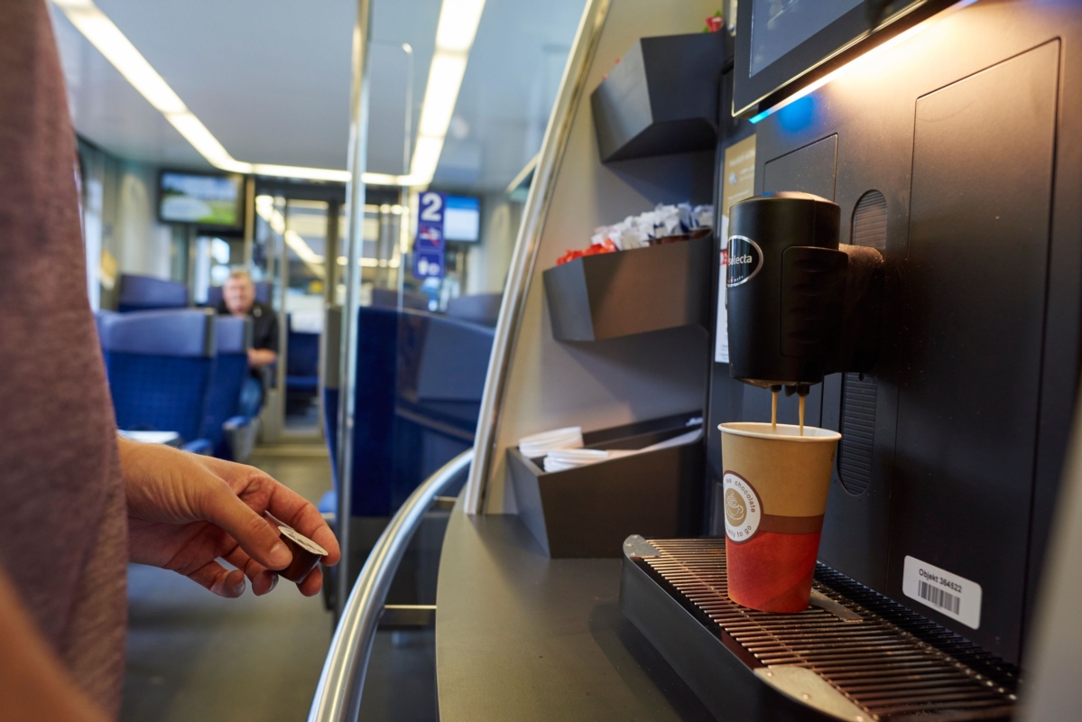 Der Verpflegungsbereich befindet sich in der Mitte des Zuges. Die Fahrgäste können süsse und salzige Snacks beziehen. Auch sind kalte Getränke, verschiedene Kaffeegetränke, Tee und Suppe erhältlich.