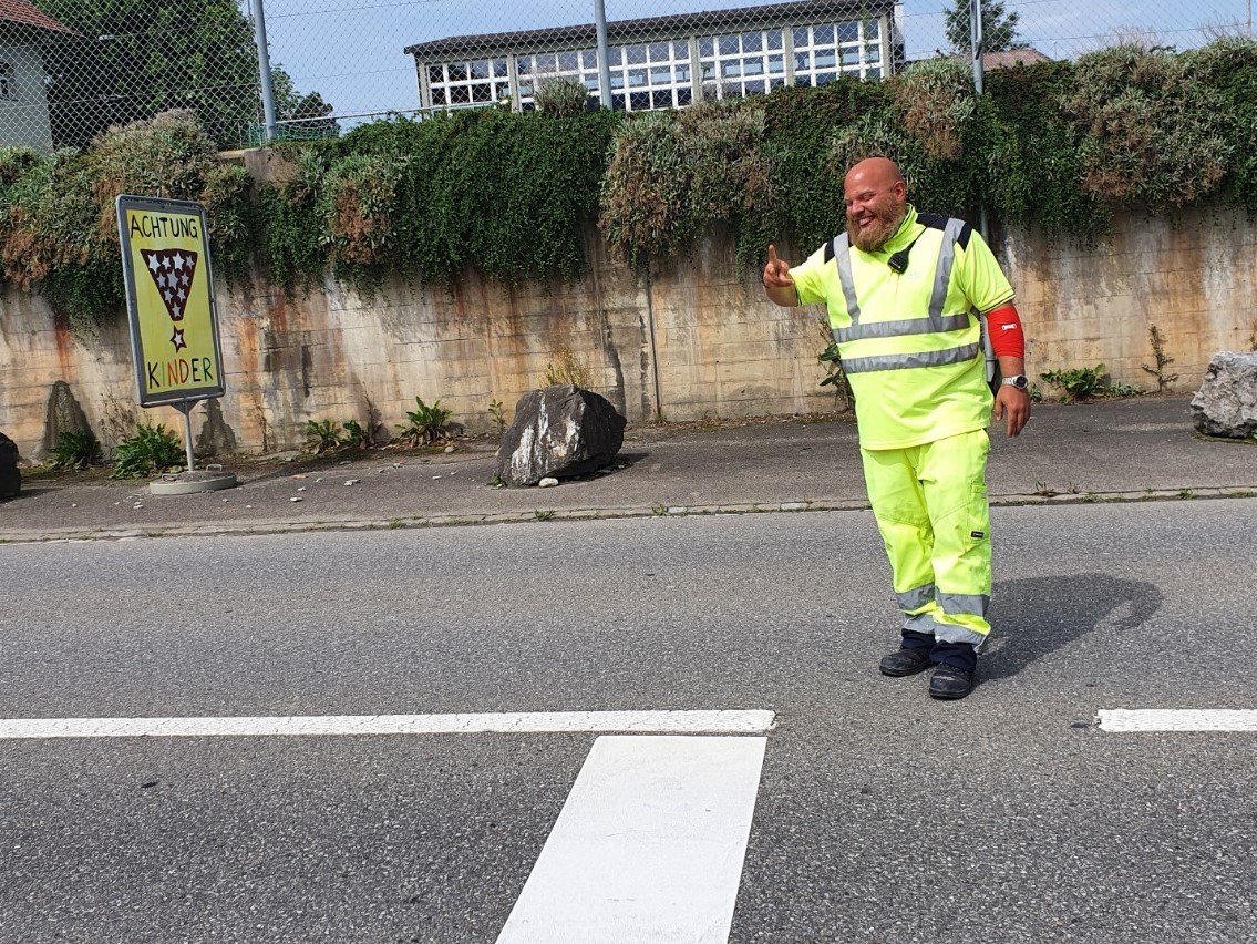 "Die meisten Leute geben mir ein Lachen zurück", erzählt Zbinden. Ob er den Verkehr auch so fröhlich durchgewinkt habe, als es regnete? "Klar, fürs Wetter kann ich ja nichts." Wieder strahlt er, macht das Victory-Zeichen, nickt und winkt Autos durch. Auch wenn er einkaufen gehe, versuche er jeweils so freundlich wie möglich aufzutreten. Ich glaube es ihm. Es gibt auch Autofahrer:innen, die ihn mürrisch anschauen, solche die nicht winken. "Jeder hat seinen Rucksack, die können nichts dafür."