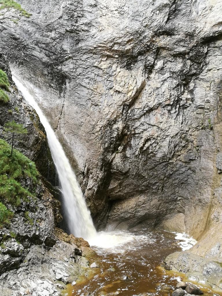 Die Wanderung ging dann dem Rotbach entlang zur Schwefelquelle. Hier standen bis zum Hochwasser 1902 Badhäuser, die das heilende Wasser anpriesen. Leider führt die Quelle nicht mehr so viel Wasser wie zu den Zeiten der regen Badetätigkeit. Kurz nach der Quelle vereinen sich der Seebebach und Rotbach. Die Wanderung führte dem Seebebach entlang zum ersten Wasserfall. Nach kurzer Zeit standen die Konolfinger auf der Hängebrücke im Chessiloch. Hier spürte man die Kraft des kühlen, weiss gischenden Wassers des zweiten Wasserfalls direkt.