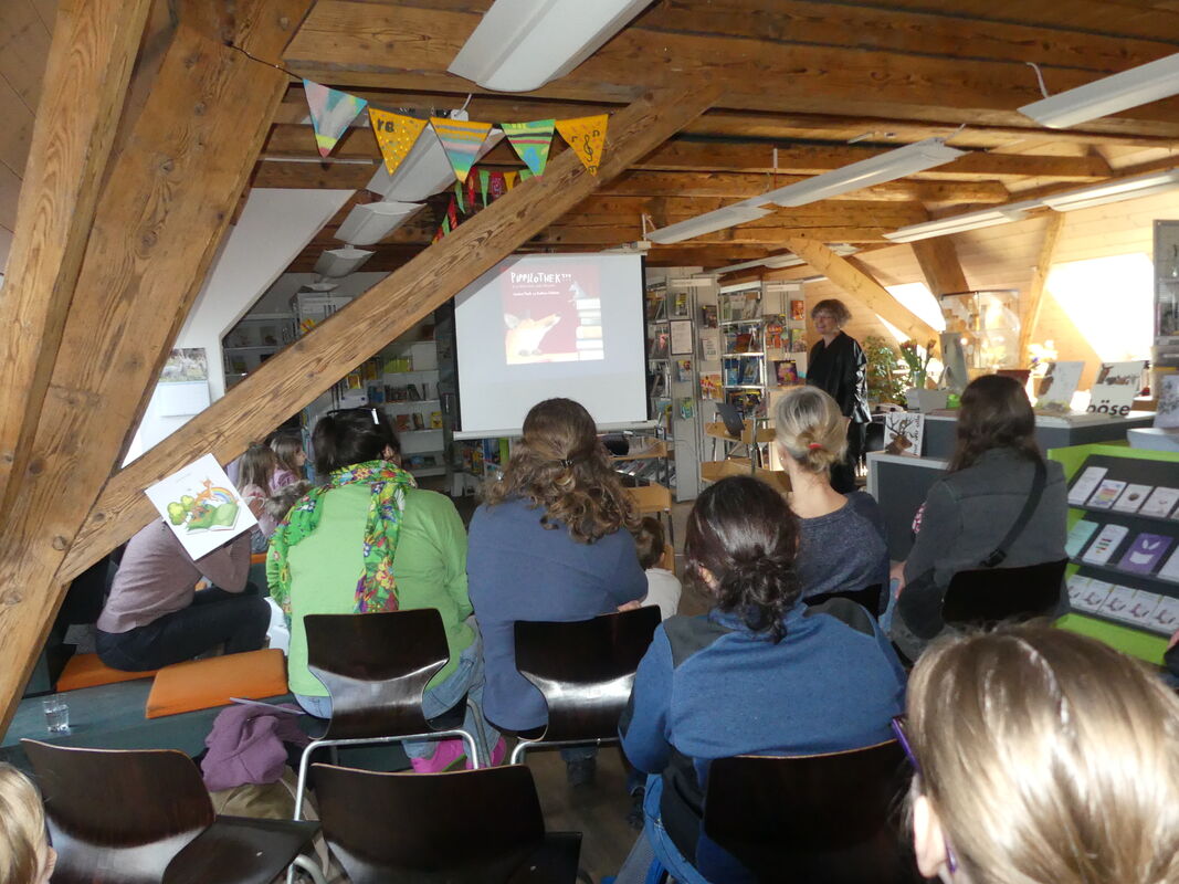 Nach dem freien Workshop "Postkarten gestalten" durften die Kinder und ihre Eltern einige ganz spezielle Lesungen geniessen. Kathrin Schärer (Dornach), die renommierte Schweizer Illustratorin und Kinderbuchautorin, erzählte aus den von ihr illustrierten Kinderbüchern. Mit ihren emotionalen und fesselnden Vorträgen von "Pippilothek", " Ei, Ei, Ei, die Maus hilft aus" und "böse" und den per Beamer passenden Zeichnungen zog sie die Kinder sofort in ihren Bann. Zum Abschluss entführte sie die Anwesenden mit der lebendigen Erzählung in eine Welt voller Fantasie zur "Fliege Ziege". Ihre detailreichen, lebendigen Zeichnungen und Illustrationen – die oft Tiere als Hauptfiguren zeigen – zeichnen sich durch einen warmen, ausdrucksstarken Stil aus.