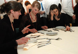 Zweifellos der Höhepunkt dieses Kurstages war der Fünfgänger, der den Schülerinnen und Schülern serviert wurde. Zuerst galt es aber, selber den Tisch zu decken, von Grund auf, beginnend beim Legen des Moltons bis hin zum Platzieren der Kerzenständer. Wo genau kommen die vielen Gabeln, Löffel und Messer hin, wie genau ordnet man die verschiedenen Gläser (ganz Migros-like gab es zum Znacht alkoholfreie Getränke wie Jus de Pommes Blanc 2005, Château G & A Duttweiler oder Jus de Raisins Rouge 2005, Appélation Aproz controlé)? Nadisna verwandelt sich das anfänglich nüchtere Zimmer dank des Engagements und dem Flair der Jugendlichen in einen wunderschön aufgedeckten Bankettsaal. Dann konnte es losgehen, mit dem Galadiner, jeweils immer mit guten Tipps von Claudia Boess begleitet. Darf man die Salatsauce mit Brotstücken auftünchen? Wie genau geht man mit dem Fischmesser um? Wie schälen sich Mangos? Nettes Detail am Rande: Im Gegensatz zur Theorie, als auf der einen Seite des langen Tischen die Damen, auf der anderen die Herren sassen, mussten die Jugendlichen nach den Anstandsregeln Frau-Mann-Frau sitzen (ganz abgesehen davon, dass die jungen Damen in ihren attraktiven Outfits wirklich verdient, hatten, jeweils zwischen zwei Gentlemen sitzen zu dürfen).