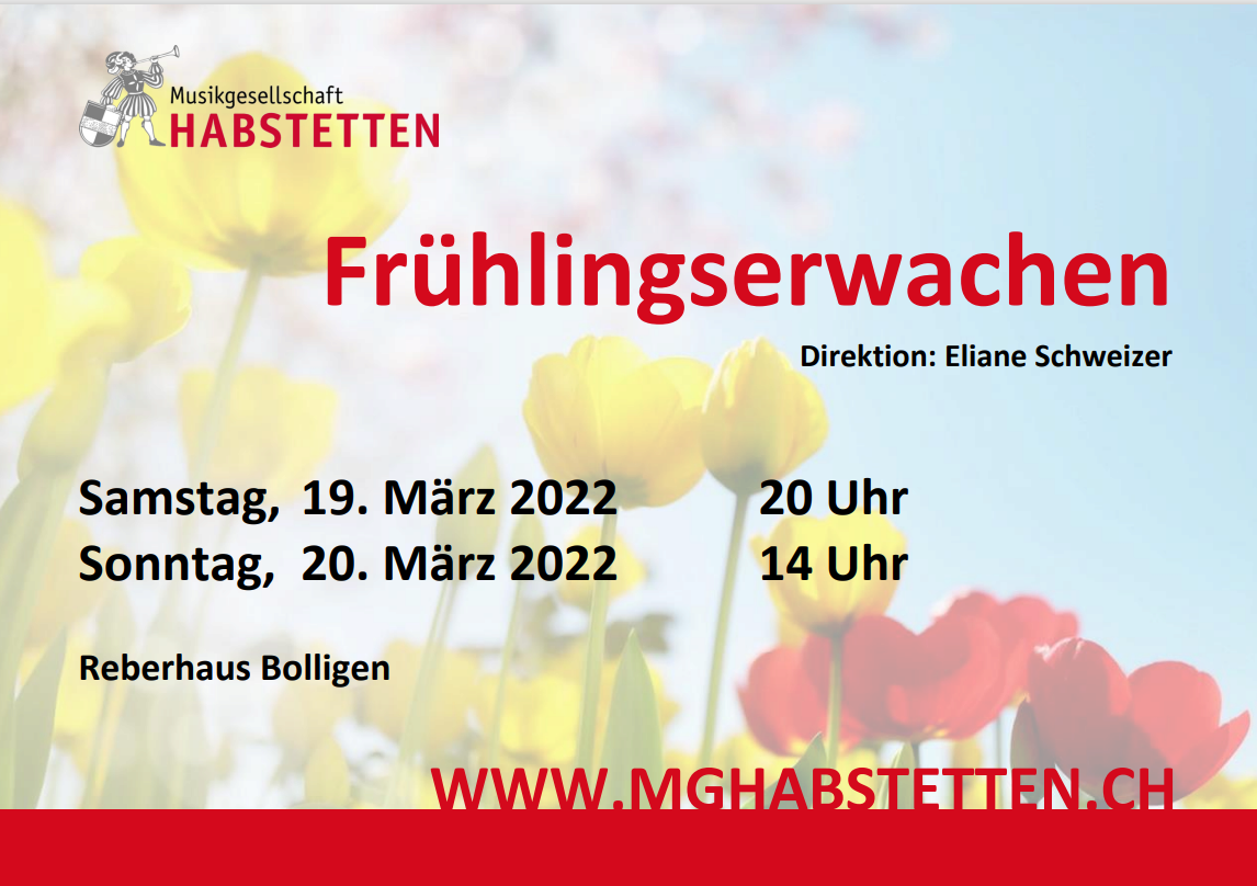 Unser Konzert Frühlingserwachen symbolisiert nicht nur den Aufbruch der Natur im Frühling, sondern auch den Aufbruch von uns selbst, der Musikgesellschaft Habstetten. In den Jahren 2020 und 2021 war es uns auf Grund der Pandemie leider nicht möglich, im Frühling im Reberhaus in Bolligen zu spielen. Auch viele andere Anlässe fielen ins Wasser, das Vereinsleben hat gelitten. Nun wagen wir jedoch den Aufbruch und präsentieren Ihnen in einem herrlichen Strauss bunter Frühlingsblumen verschiedenste Literatur, die zum Thema Neubeginn passt. Am Konzert erwartet Sie ausserdem unsere MGH-Tombola mit vielen schönen Preisen sowie unsere leckere Festwirtschaft.