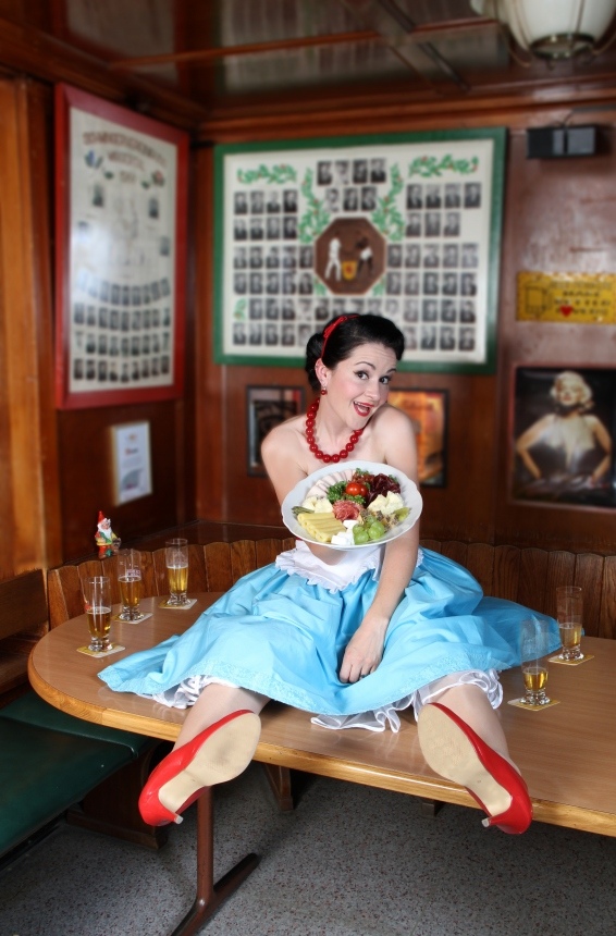 Gitarre, Trompete, Öiphonium, Klavier, Nachttischlämpli… die halbe Stube führt Frölein Da Capo mit sich, wenn sie auf der Bühne performt. Mit dem Loop-Gerät wird dieses Arsenal live zusammengemischt und hübsch arrangiert. Das Programm heisst „gemischtes Plättli“ und ist auch öppe so vielsaitig wie der Name verspricht. In ihren Mundart-Liedern behandelt Frölein Da Capo die wirklich wichtigen Dinge des Lebens wie Schuhe, Haarteile, Sporthosen. Natürlich geht’s auch nicht ohne das eine Thema: Männer. Und so philosophiert sich die Provinz-Diva einmal mehr in Fahrt und Rage, lässt dabei tief blicken (also…metaphorisch gesprochen) und ihren Gedanken freien Lauf. Was nicht in jedem Fall eine gute Idee ist.