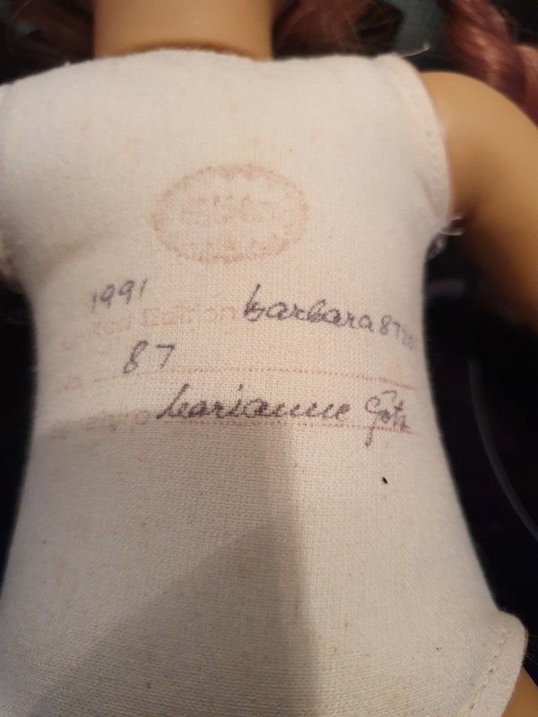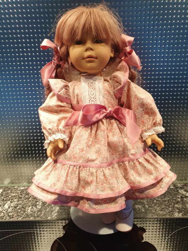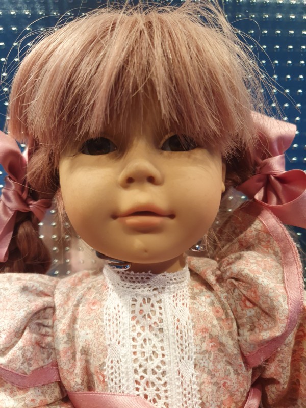 in Originalkleidern, Echthaar (meines Wissens) Körper aus Stoff, Beine, Arme und Kopf Vinyl, braune Glasaugen,