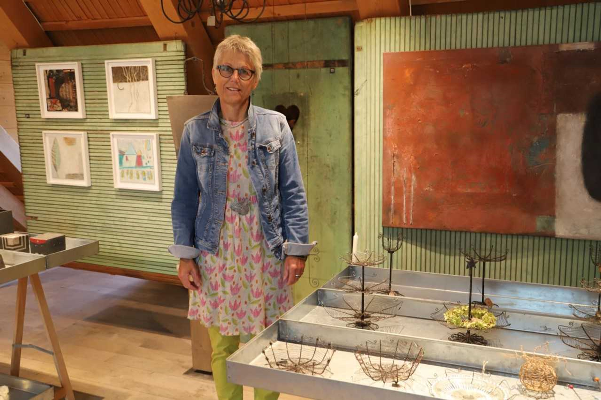 Die Materialien von Erika Linder sind bekannt. Aus Ton, Farbe und Draht erstellt sie Kunstwerke und Bilder. Die Kombinationen der erstellten Kunstwerke mit alten Holzbalken, die mit einigen Farbtupfern oder kleinen Gegenständen verziert werden, passen ebenso wie die farblich abgestimmten Bilder. Selbstgeschöpftes Papier nutzt Annemarie Rüegsegger für ihre Kreationen. Aus diesem Grundmaterial entstehen Vasen, Kerzenständer und Schalen. Ja sogar gehäkelt wird das Papier. "Neue habe ich auch einige textile Gegenstände entworfen. Dazu verwende ich auch Mohn-Samenkörper mit Stiel um meinen fliegenden Engeln einen Körper zu geben".