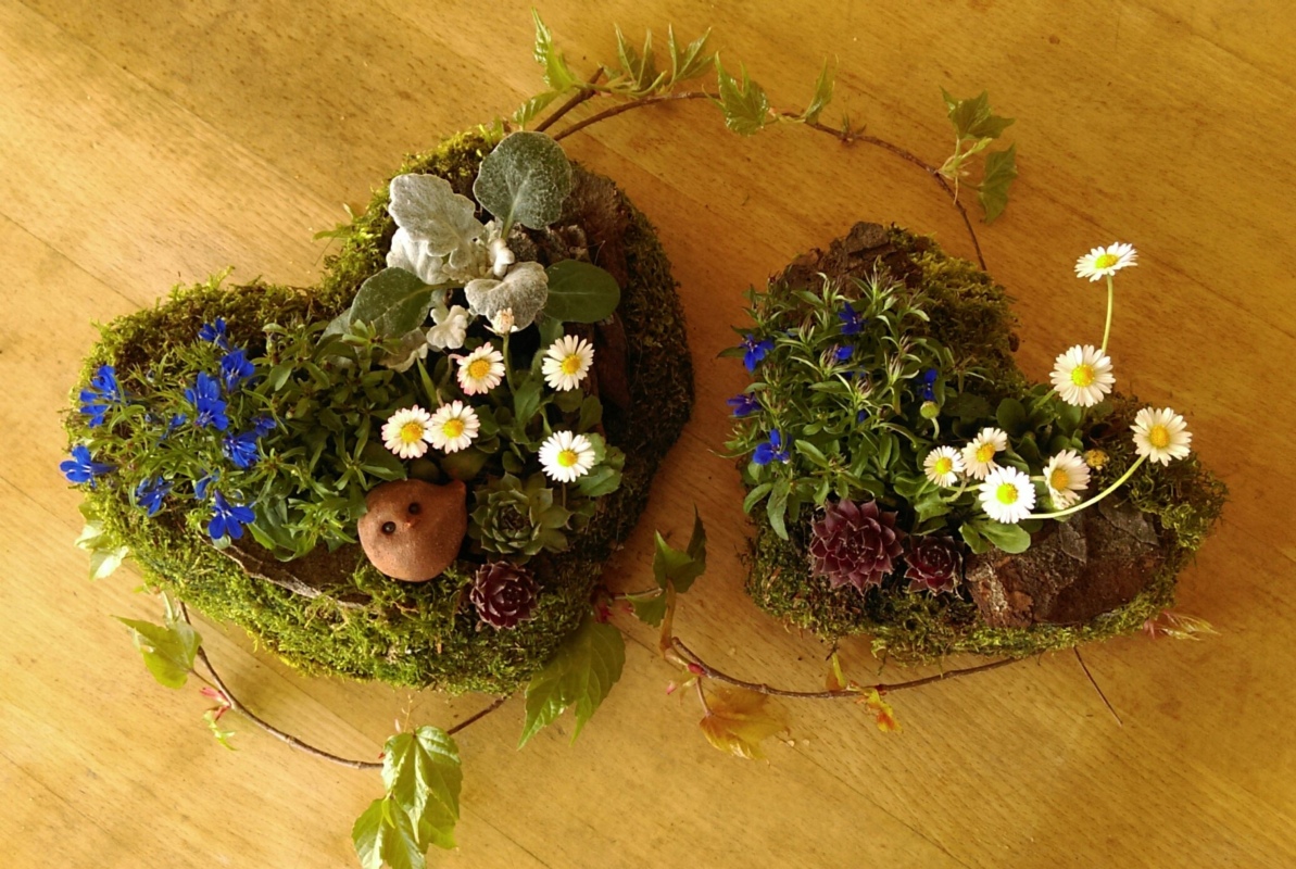 Aus Moos kreieren wir Gefässe zum Aufhängen oder Aufstellen und füllen sie mit den zur Jahreszeit passenden Pflanzen.