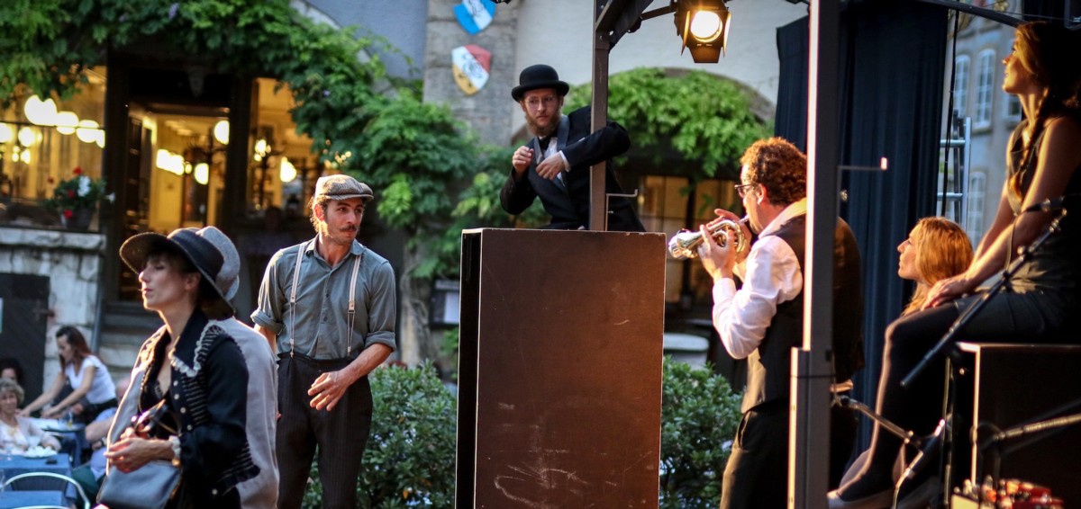 Abenddämmerung, auf dem Platz steht ein magisches Theater-Kaleidoskop. Feierlich werden Freiwillige auf eine Reise eingeladen … Musik setzt ein, die Bühne beginnt zu atmen. Klappen öffnen sich – die Show beginnt!