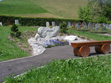 Zwei Holzbänke laden zum Verweilen ein unter dem von Pfarrerin Frieda Schranz anlässlich des 20jährigen Dienstjubiläums gespendeten Ahornbaum. Ins Steinbeet eingelassen wurde eine Natursteinplatte, die mit einer dunklen Metallplatte versehen ist, auf der die Namen der Bestatteten eingraviert werden können.